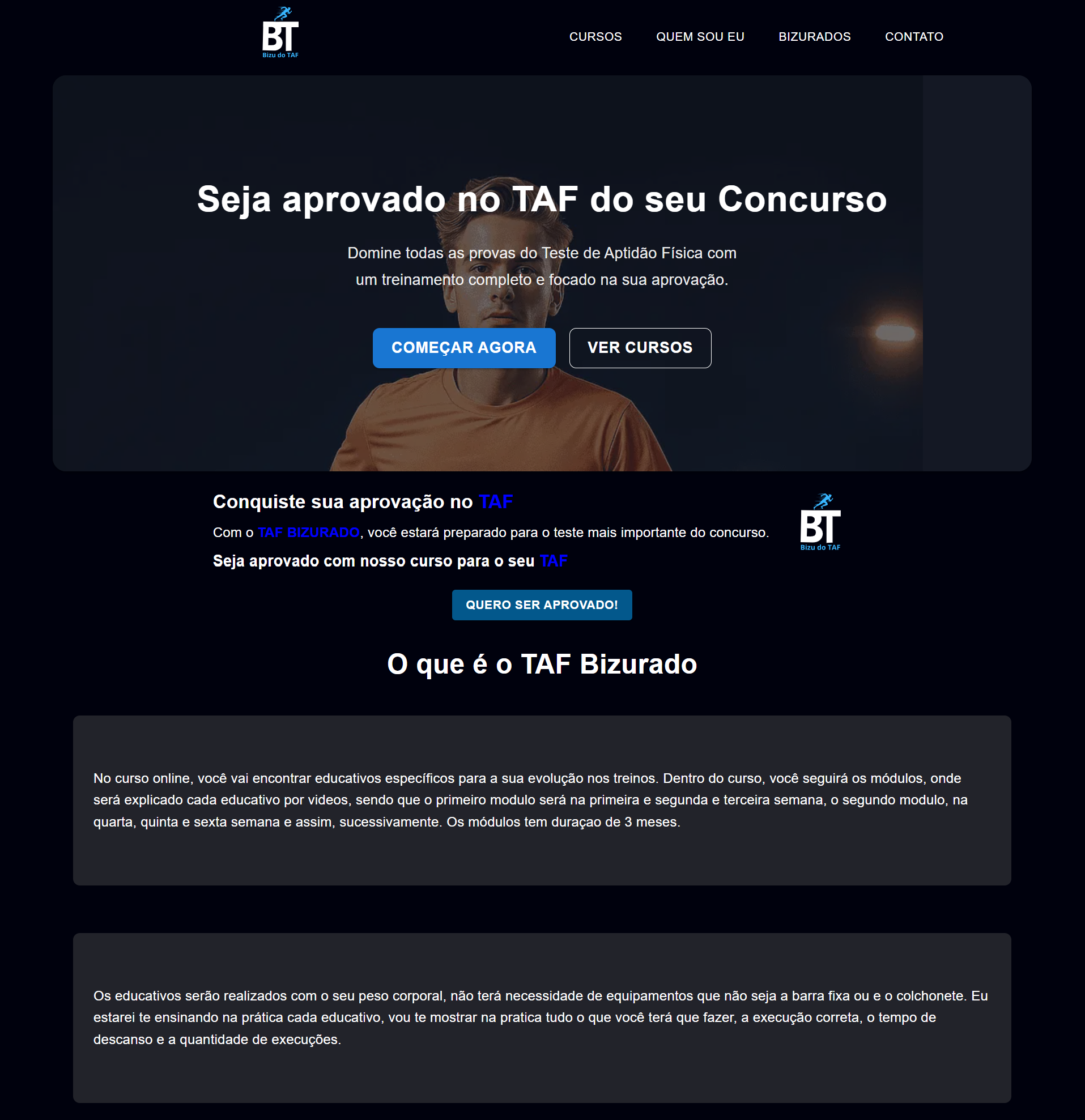 Plataforma online para auxiliar candidatos em treinamentos e dicas para o Teste de Aptidão Física (TAF). Conteúdo prático, simulados e recursos para melhorar o desempenho nos exames físicos.