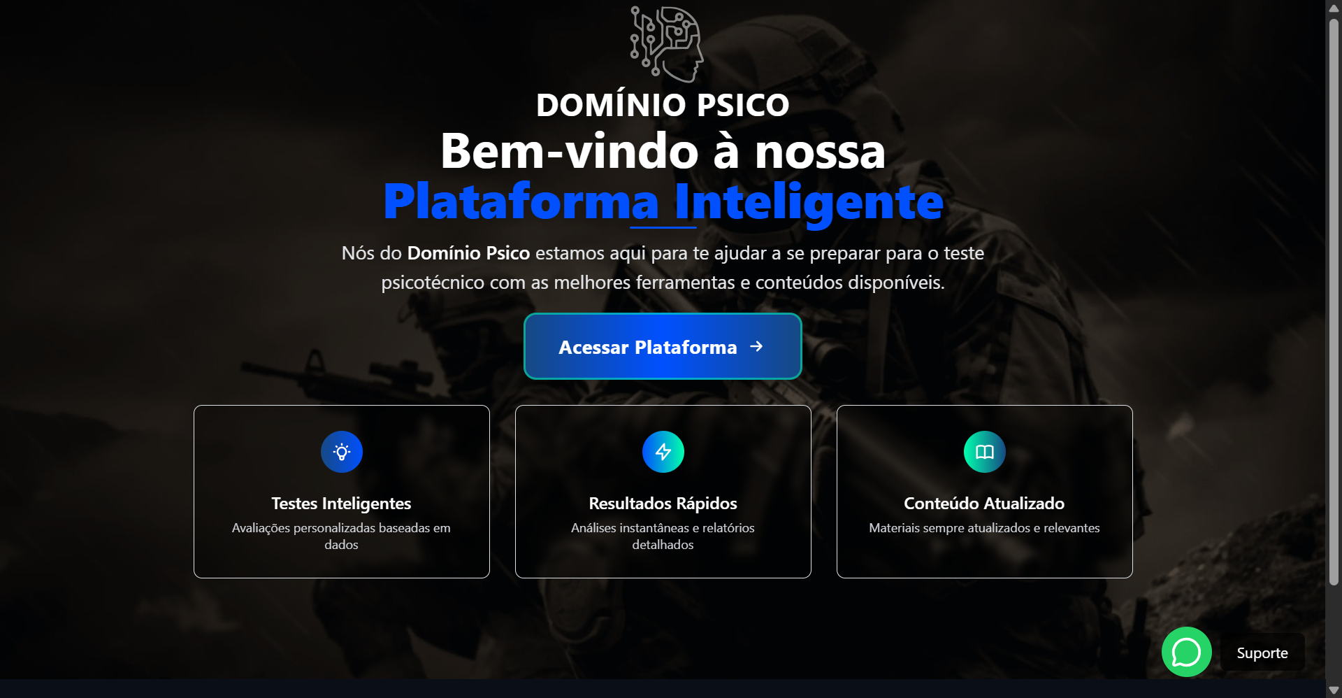 Plataforma inteligente para preparação de testes psicotécnicos, oferecendo ferramentas avançadas, avaliações personalizadas, resultados rápidos e conteúdo sempre atualizado para potencializar o desempenho dos usuários.